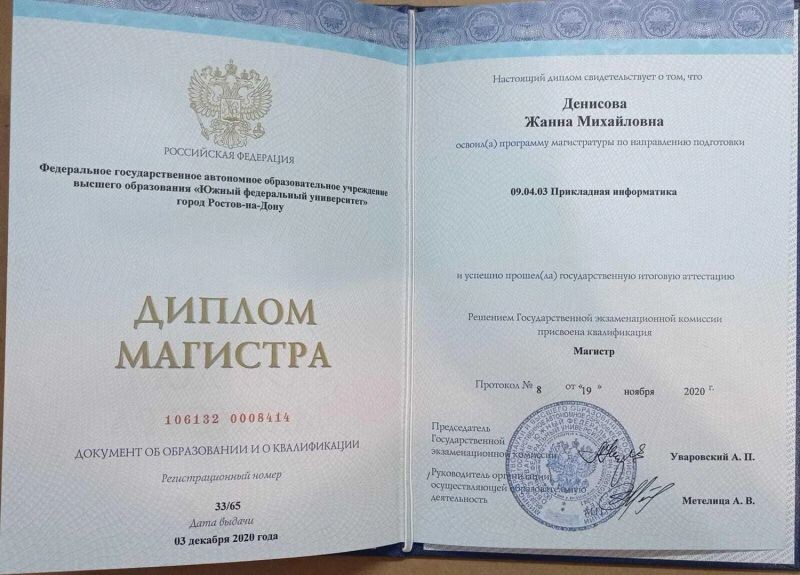 - ЮФУ, магистр по специальности «прикладная информатика», 2018–2020 гг.