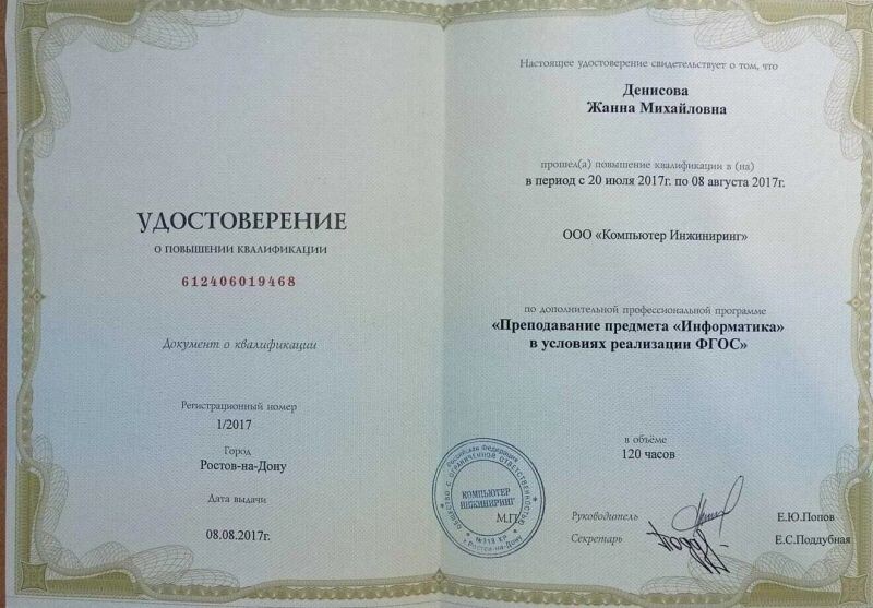 - ООО «Компьютер инжиниринг», удостоверение о повышении квалификации по программе «Информатика в условиях ФГОС», 2017 г.