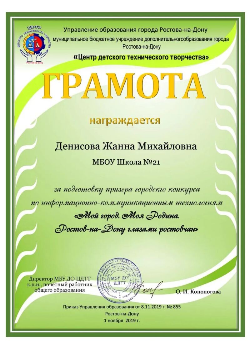 - Грамота за подготовку призёра городского конкурса ИКТ, 2019 г.
