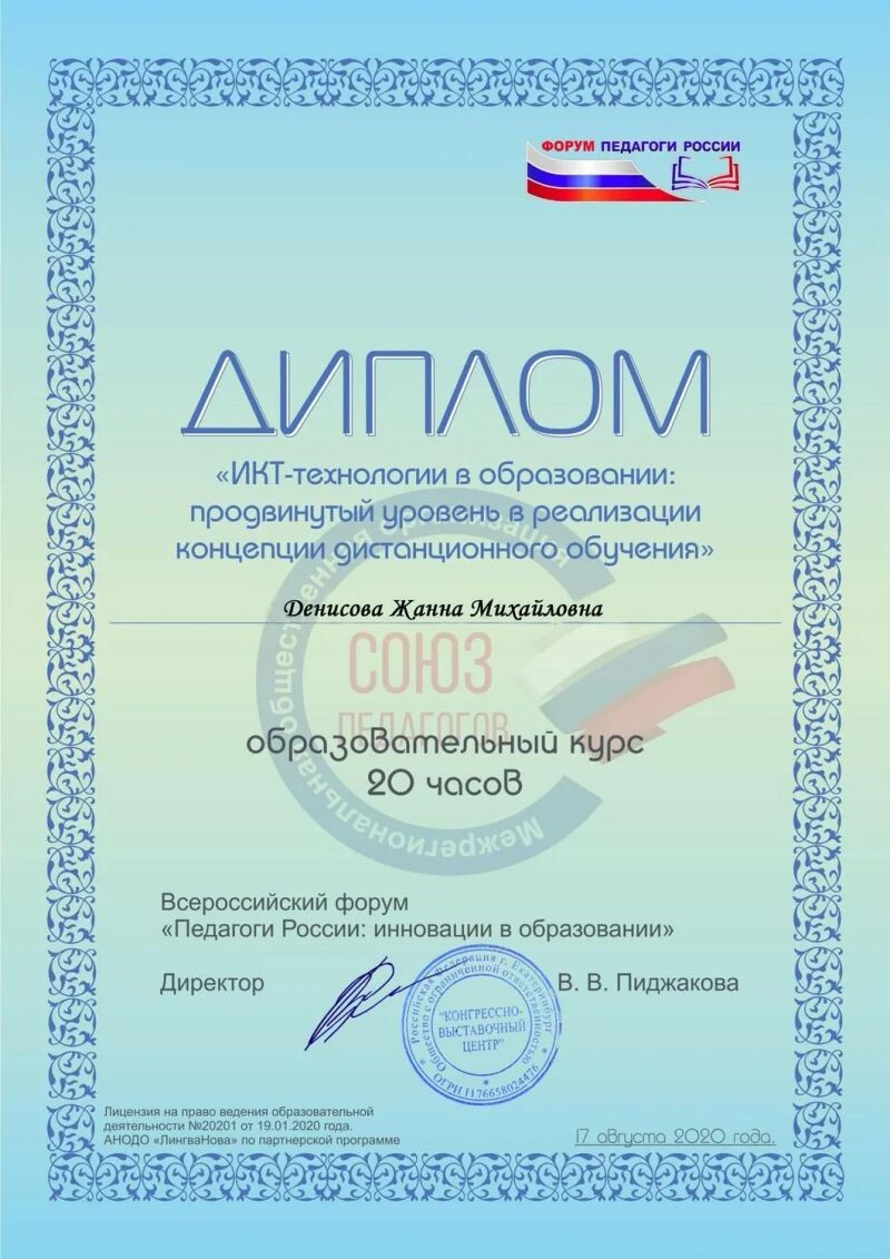 - Союз педагогов, ИКТ технологии в образовании, продвинутый уровень в реализации концепции дистанционного обучения, 2020 г.