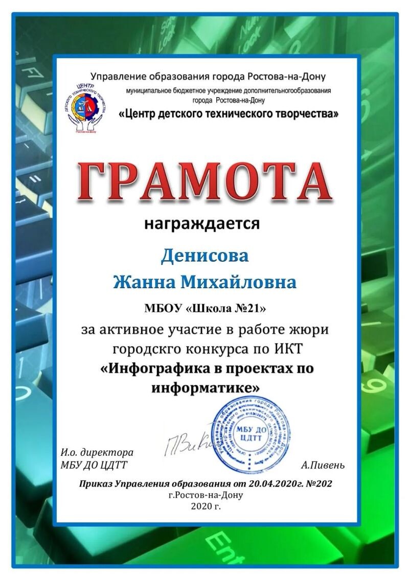 - Грамота за активное участие в работе жюри городского конкурса по ИКТ, 2020 г.