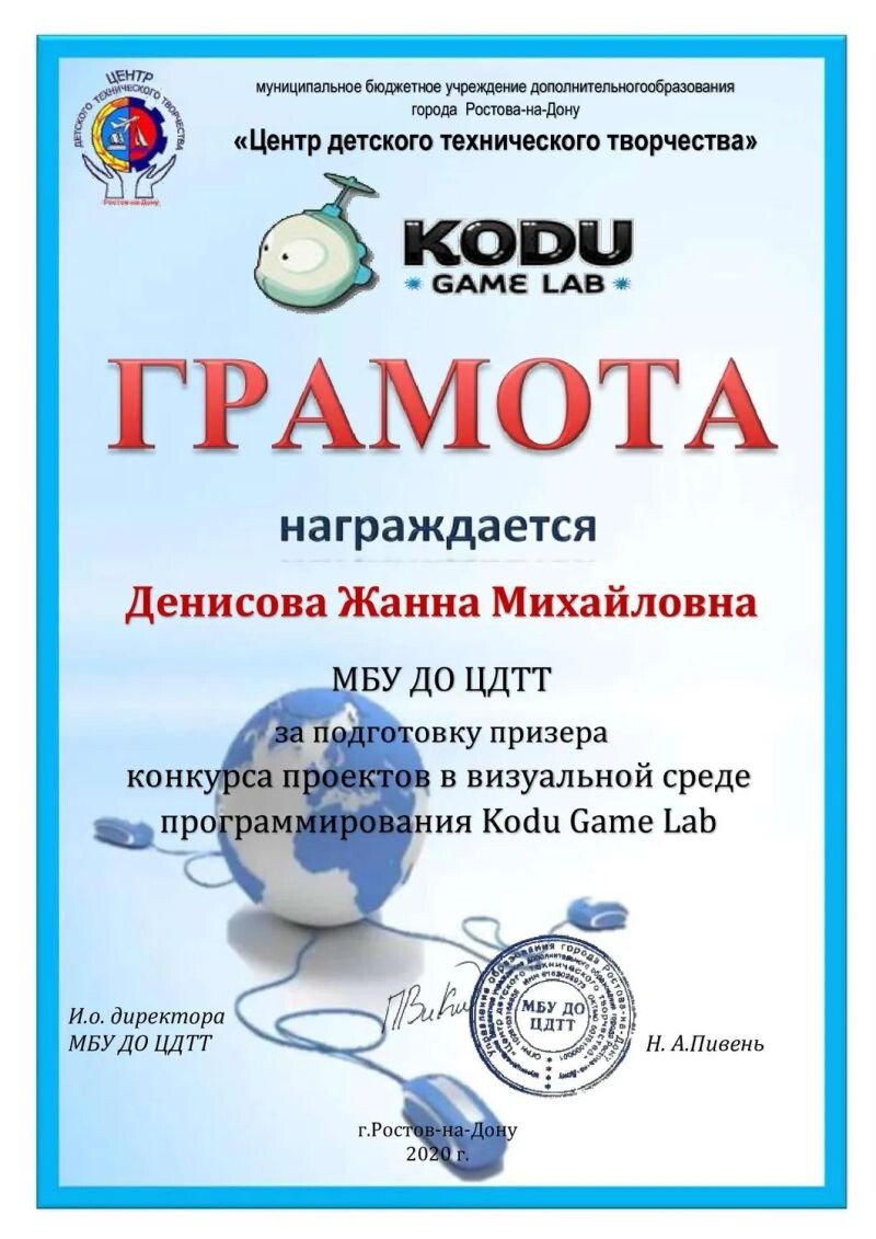 - Грамота за подготовку проектов по ИКТ в визуальной среде программирования, 2020 г.