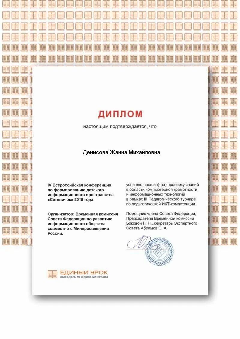 - Диплом прохождения компьютерной грамотности, 2019 г.