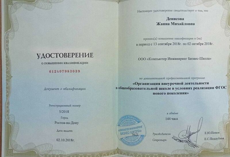 - ООО «Компьютер инжиниринг бизнес школа», удостоверение о повышении квалификации, организация внеурочной деятельности, 2018 г.