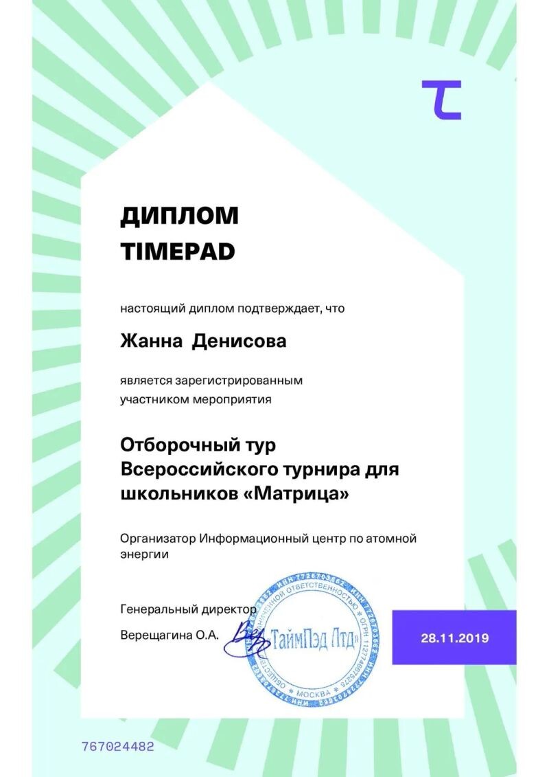 - Timepad, диплом участника отборочного тура Всероссийского турнира для школьников «Матрица», 2019 г.
