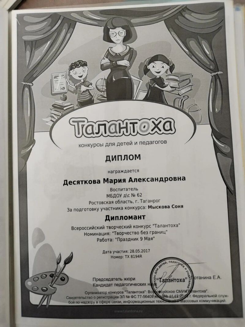 - Диплом за подготовку дипломанта Всероссийского творческого конкурса «Талантоха» в номинации «Творчество без границ», 2017 г.