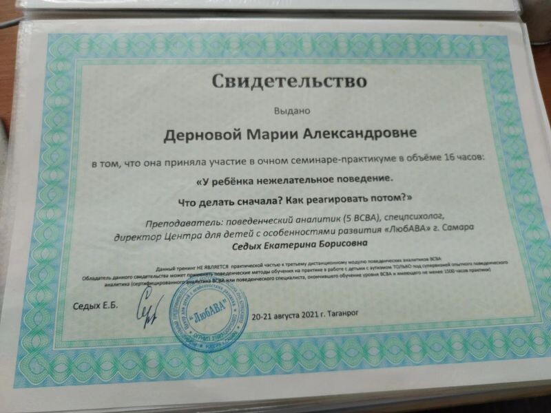 - Центр для детей с особенностями развития «ЛюбАВА», г. Самара, семинар-практикум «У ребёнка нежелательное поведение. Что делать сначала? Как реагировать потом?», 2021 г.