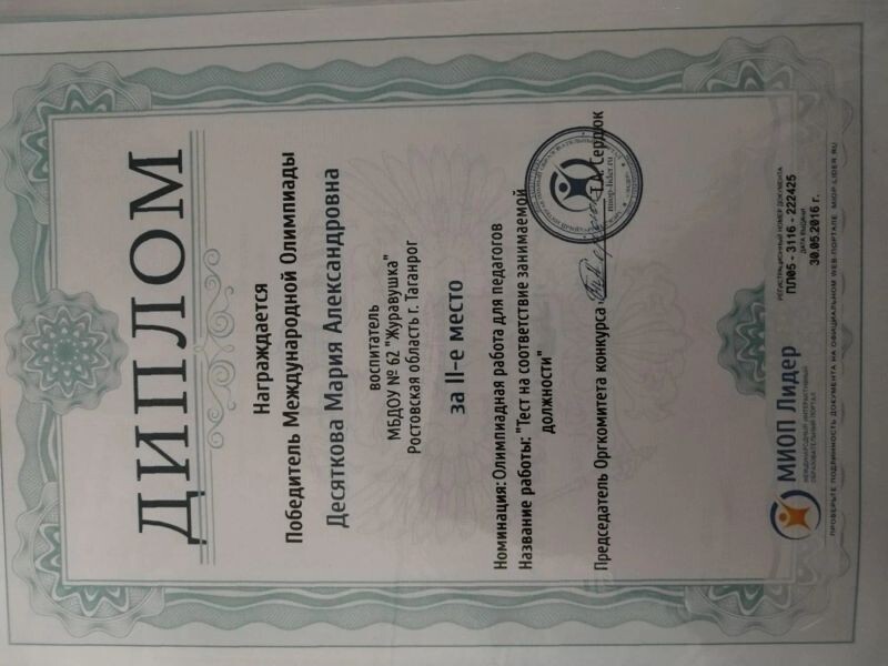 - МИОП «Лидер», Международная олимпиада, II место в номинации «Олимпиадная работа для педагогов», работа «Тест на соответствие занимаемой должности», 2016 г.