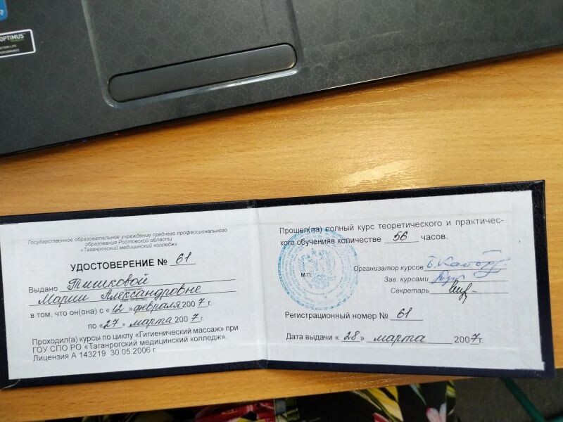 - Таганрогский Медицинский колледж, курс «Гигиенический массаж», 2006–2007 гг.