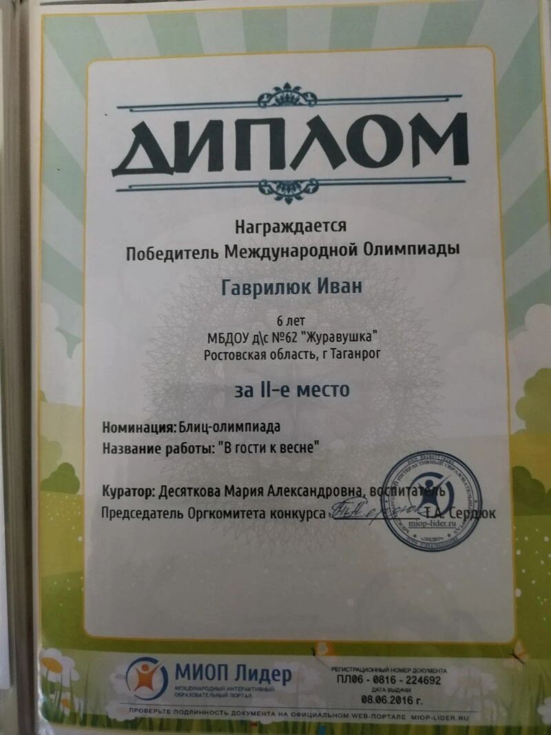 - МИОП «Лидер», Международная олимпиада, II место воспитанника в номинации «Блиц-олимпиада», 2016 г.