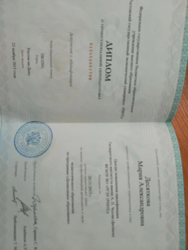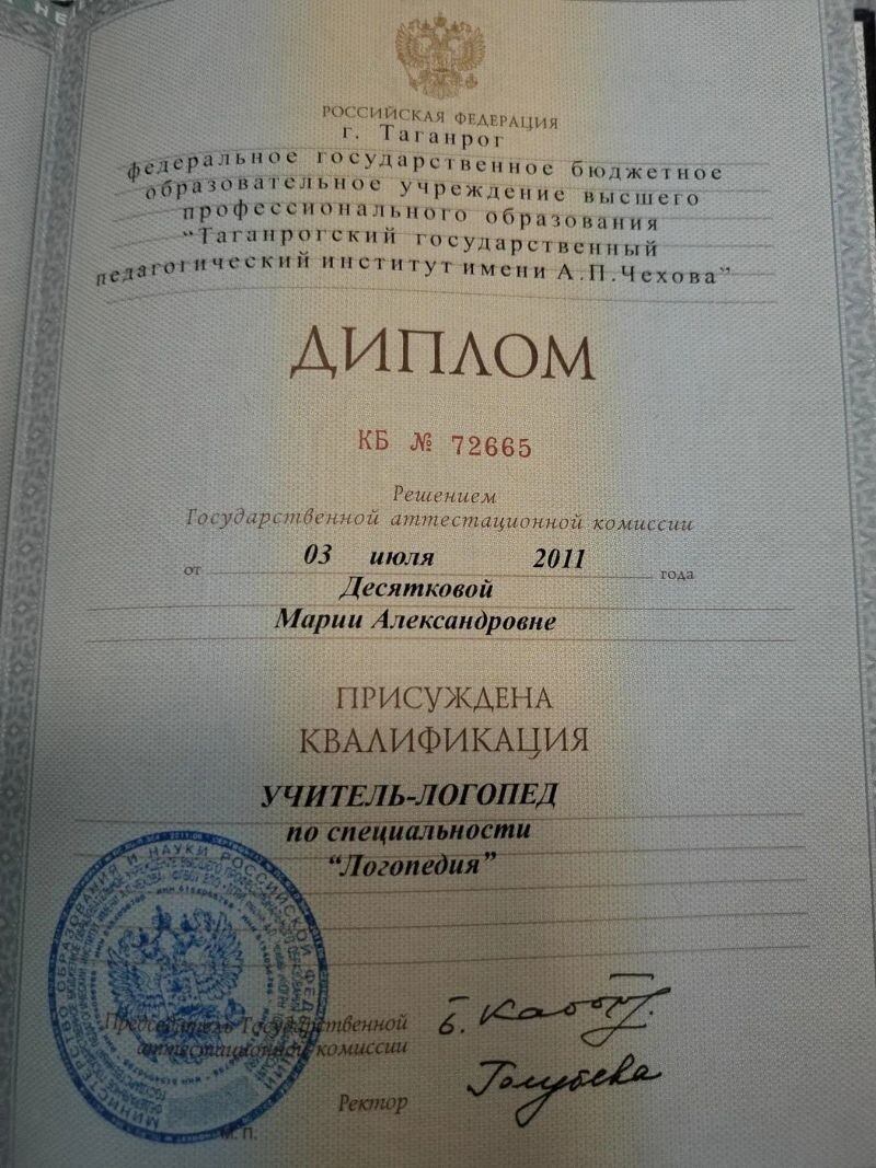 - Таганрогский Государственный Педагогический институт им.,, Чехова,, , учитель-логопед, 2007–2011 гг.