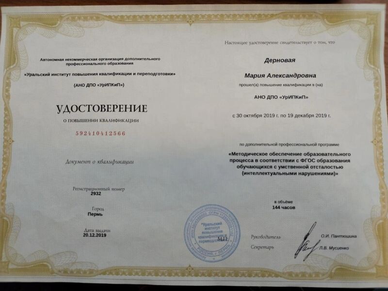 - Уральский институт повышения квалификации и переподготовки, программа «Методическое обеспечение образовательного процесса в соответствии с ФГОС образования обучающихся с умственной отсталостью (интеллектуальными нарушениями)», 2019 г.