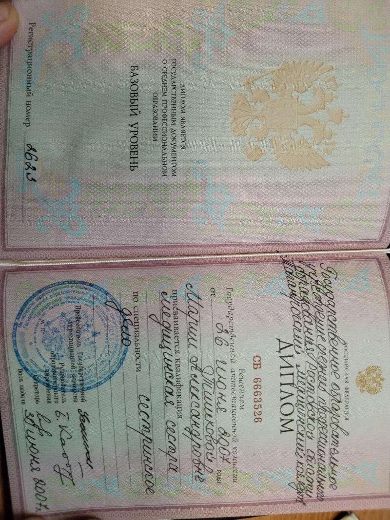- Таганрогский Медицинский колледж, сестринское дело, медицинская сестра, 2004–2007 гг.