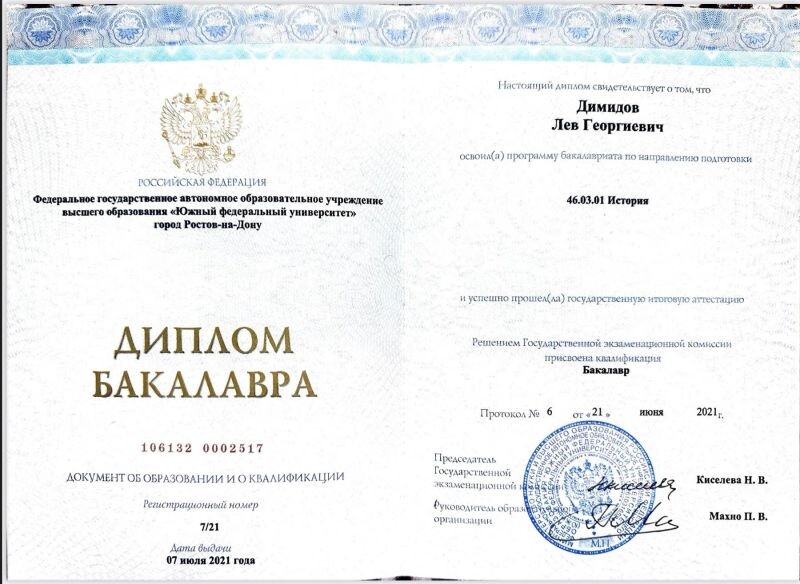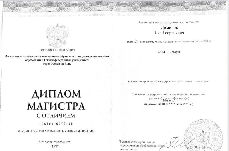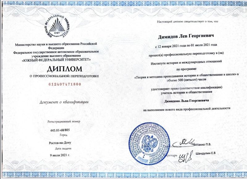 - ФГАОУ ВО «Южный федеральный университет», Институт истории и международных отношений, учитель истории и обществознания, 2021 г.
