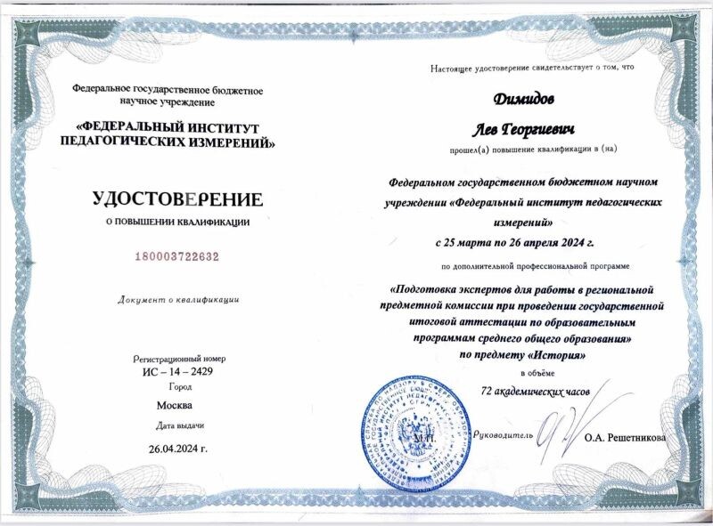 - ФГБНУ «ФИПИ», Подготовка экспертов для работы в региональной предметной комиссии при проведении государственной итоговой аттестации по образовательным программам среднего общение образования по предмету «История», 2024 г.