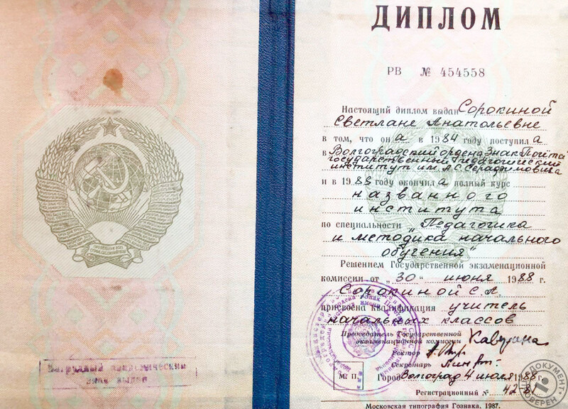 - Волгоградский государственный социально-педагогический университет, педагогический факультет, специальность – педагогика и методика начального обучения (1988 г.).