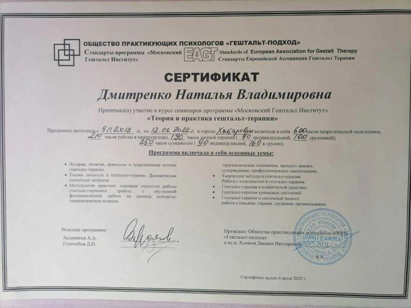 - Московский Гештальт институт, Гештальт, 600 часов, 2018–2022 гг.
