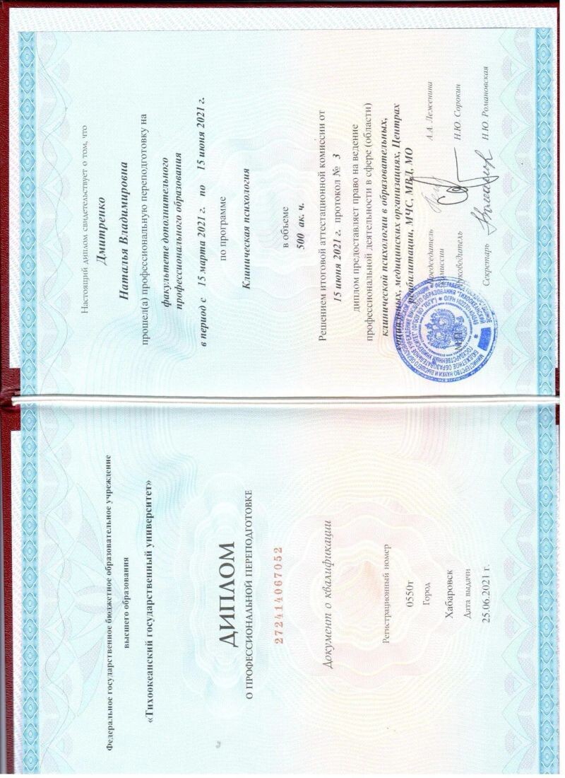 - Дальневосточный медицинский университет, Клиническая психология, 2023–2024 гг.