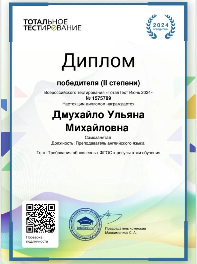 - Тотальное тестирование, диплом победителя II степени, 2024 г.