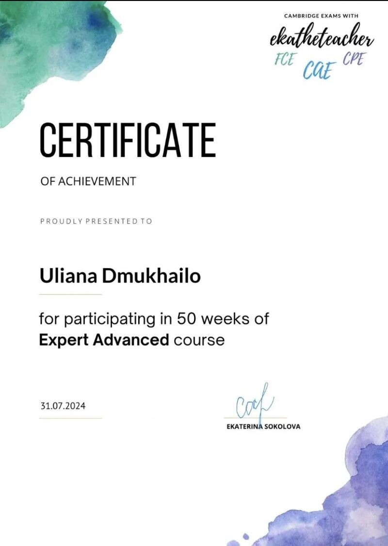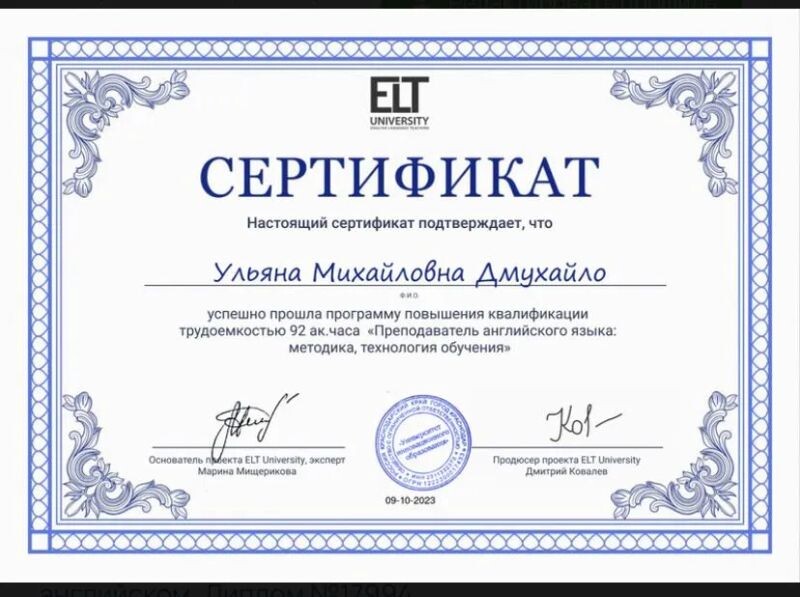 - Elt University, программа «Преподаватель английского языка: методика, технология обучения», 2023 г.