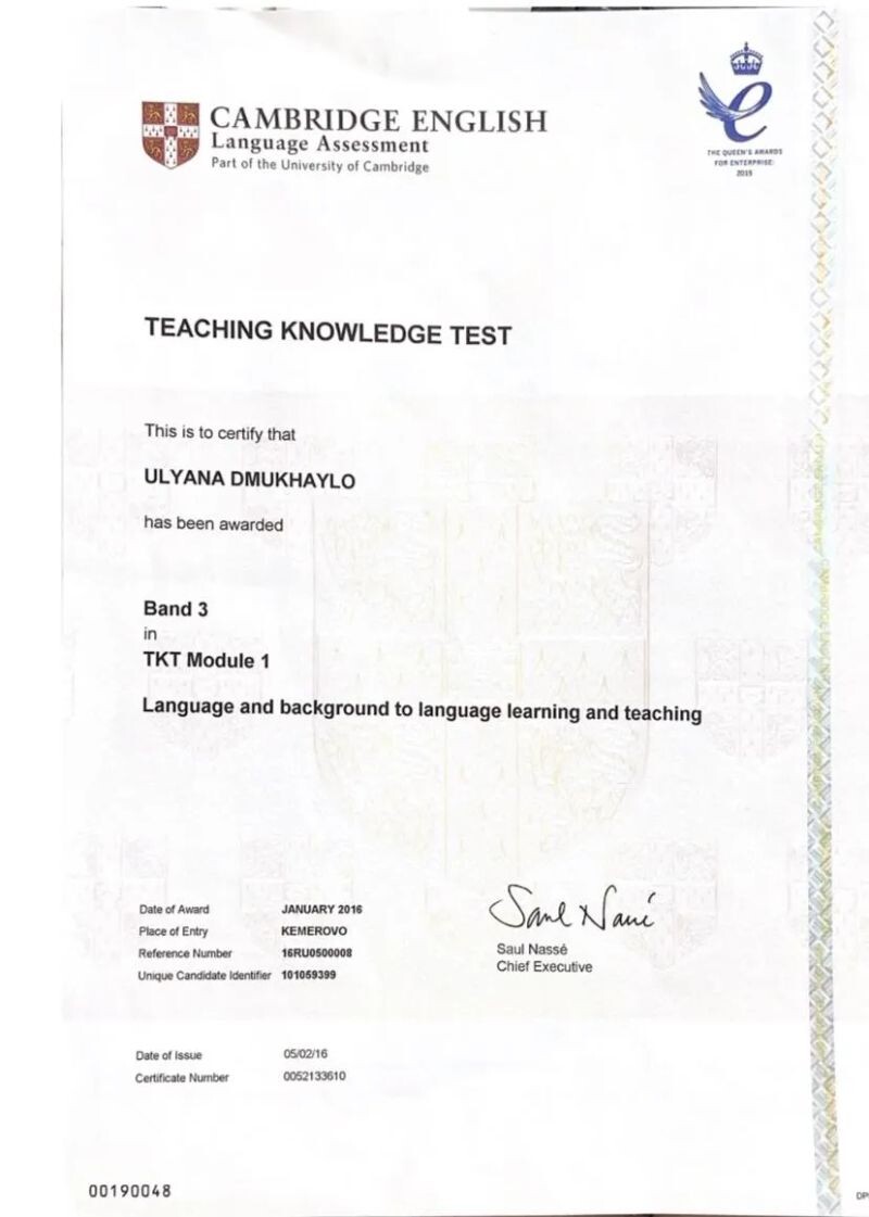 - Cambridge English, сертификат TKT Modul 1, 2016 г.