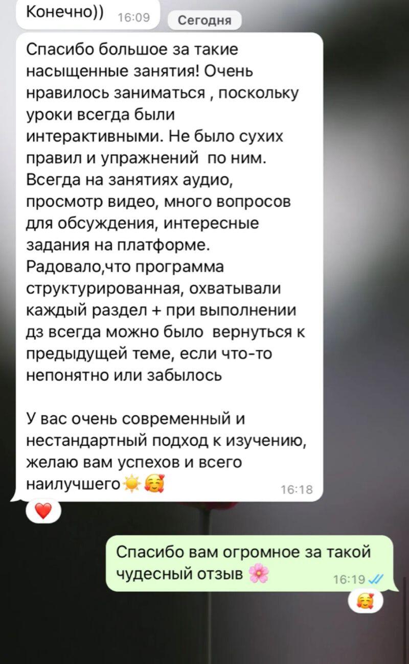 Я очень довольна этим преподавателем. Она превзошла все мои ожидания и достигла отличных результатов. Хотя я сейчас временно приостановила занятия, я полностью удовлетворена ее работой.