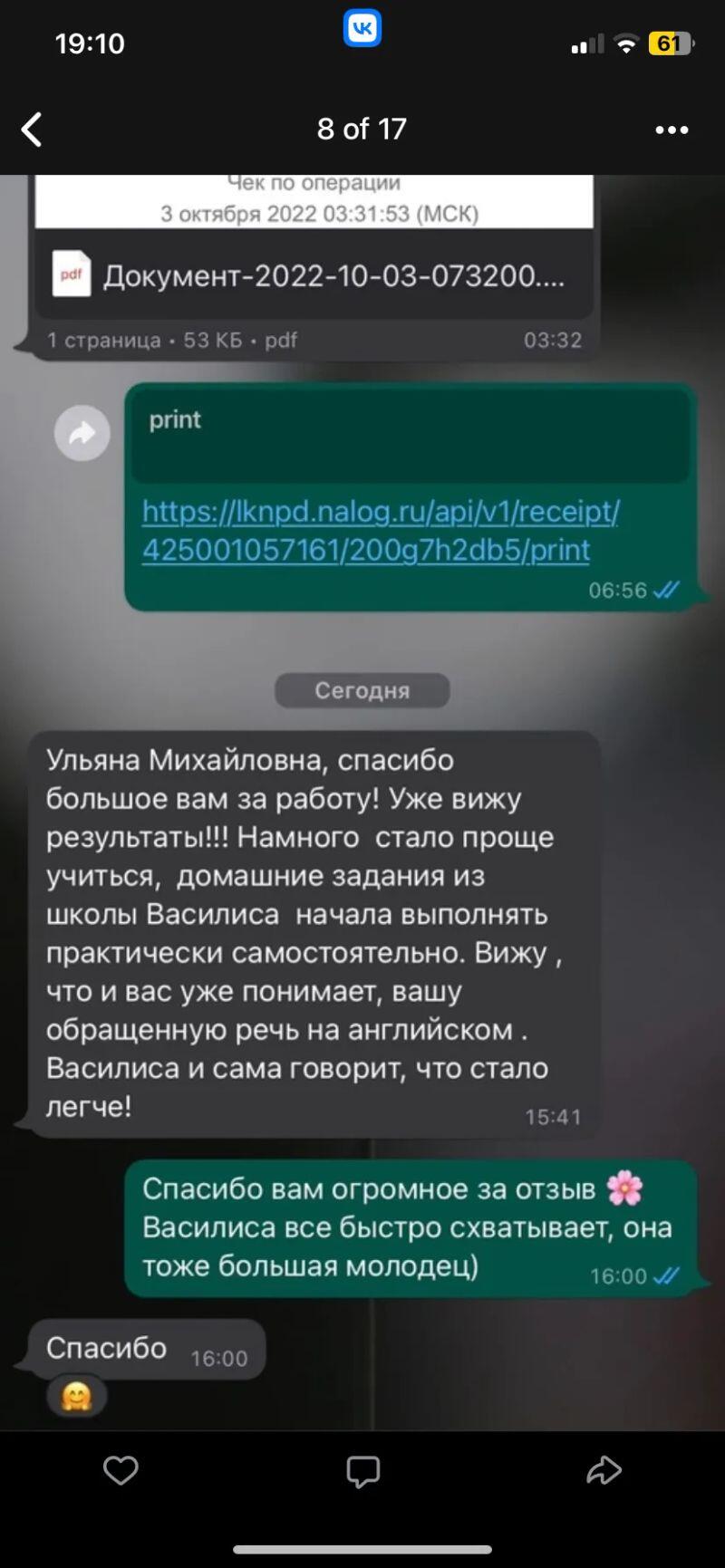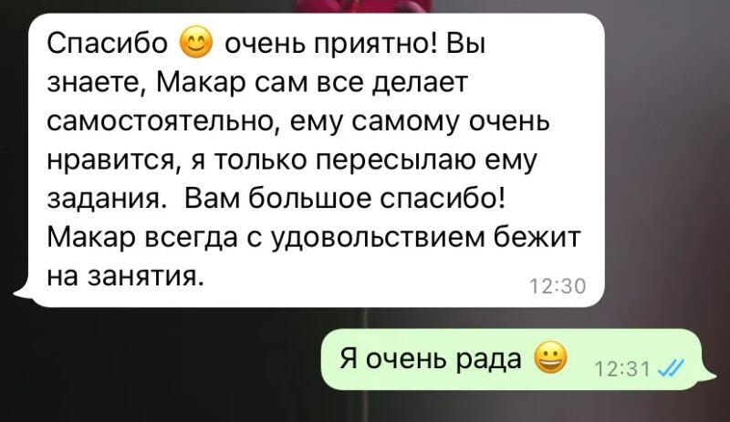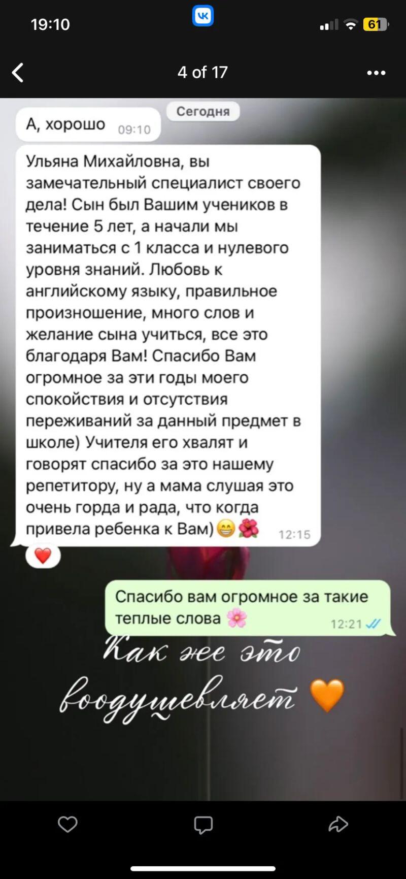 Ульяна Михайловна - лучший репетитор! Уже через месяц занятий мы видим заметные результаты. Наша дочь даже перевелась в лучшую школу. Мы не могли быть счастливее.