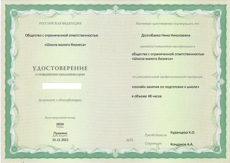 - Удостоверение о повышении квалификации (с 2022 г.).