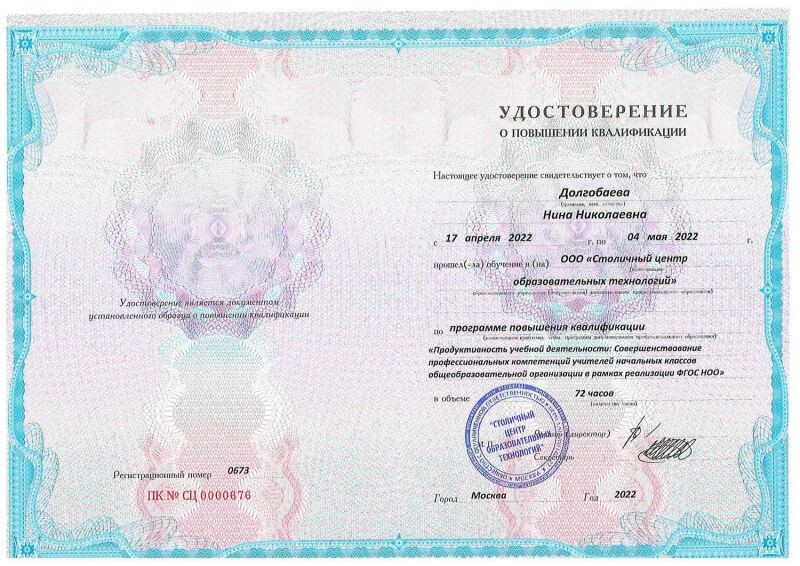 - ООО «Столичный центр», программа «Продуктивность учебной деятельности: Совершенствование профессиональных компетенций учителей начальных классов общеобразовательной организации в рамках реализации ФГОС НОО» (с 2022 г.).