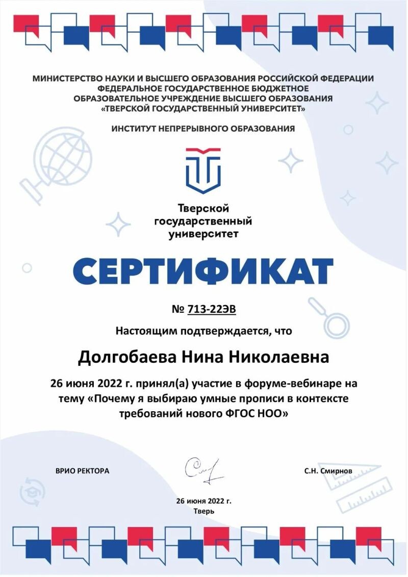- Сертификат участника вебинара, «Почему я выбираю умные прописи в контексте требований нового ФГОС НОО» (с 2022 г.).
