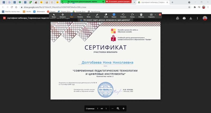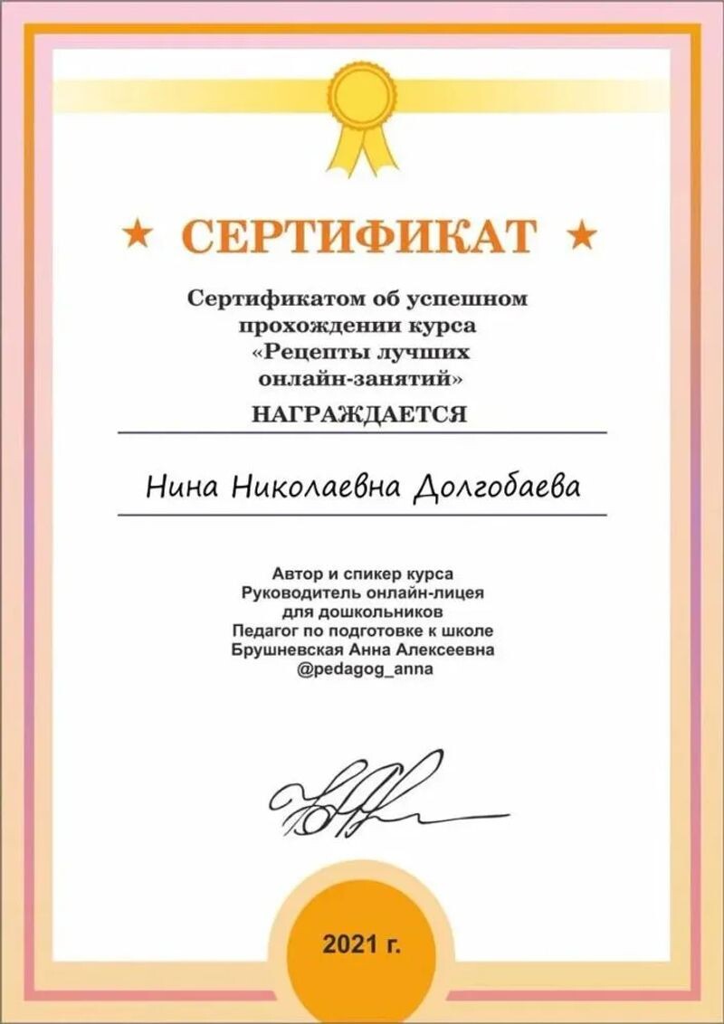 - Сертификат об успешном прохождении курса "Рецепты лучших онлайн-занятий" (с 2021 г.).