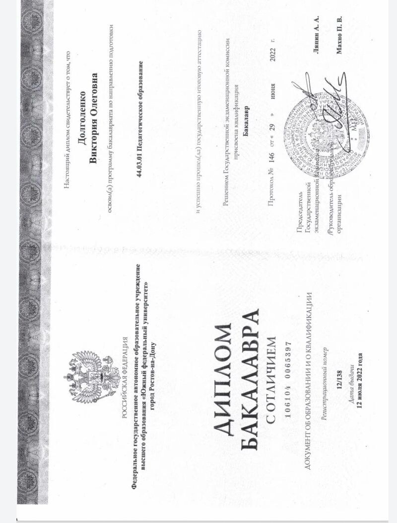 - Федеральное автономное государственное образовательное учреждение высшего образования «Южный федеральный университет», педагогическое образование, 2018–2022 гг.