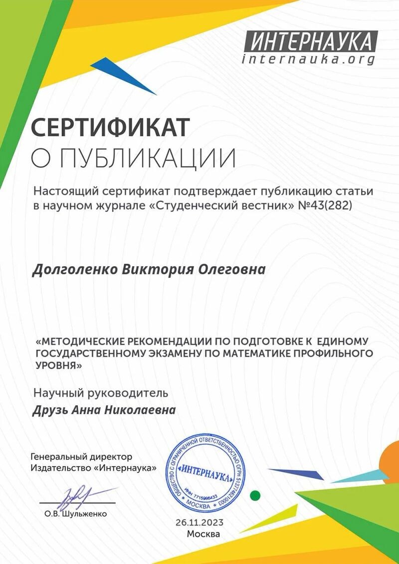 - Интернаука, сертификат о публикации статьи в научном журнале «Студенческий вестник» № 43, «Методические рекомендации по подготовке к единому государственному экзамену по математике профильного уровня», 2023 г.