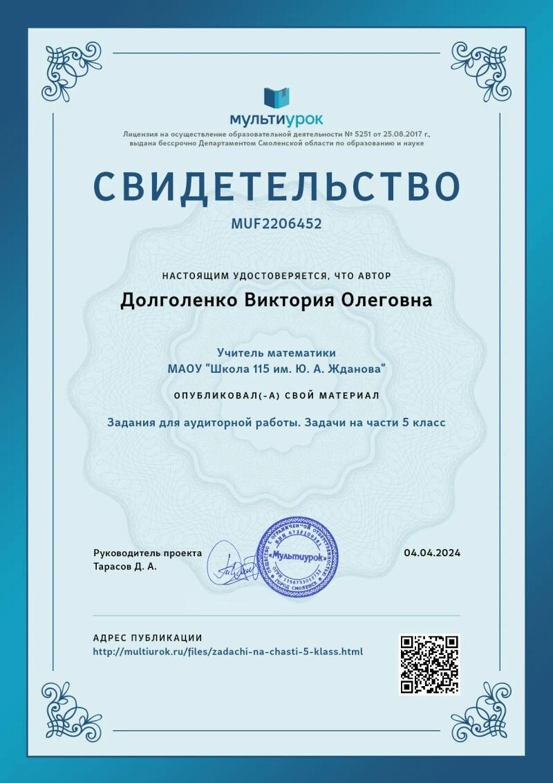 - Мультиурок, свидетельство о публикации своего материала для 5 класса «Задания для аудиторной работы. Задачи на части 5 класс», 2024 г.