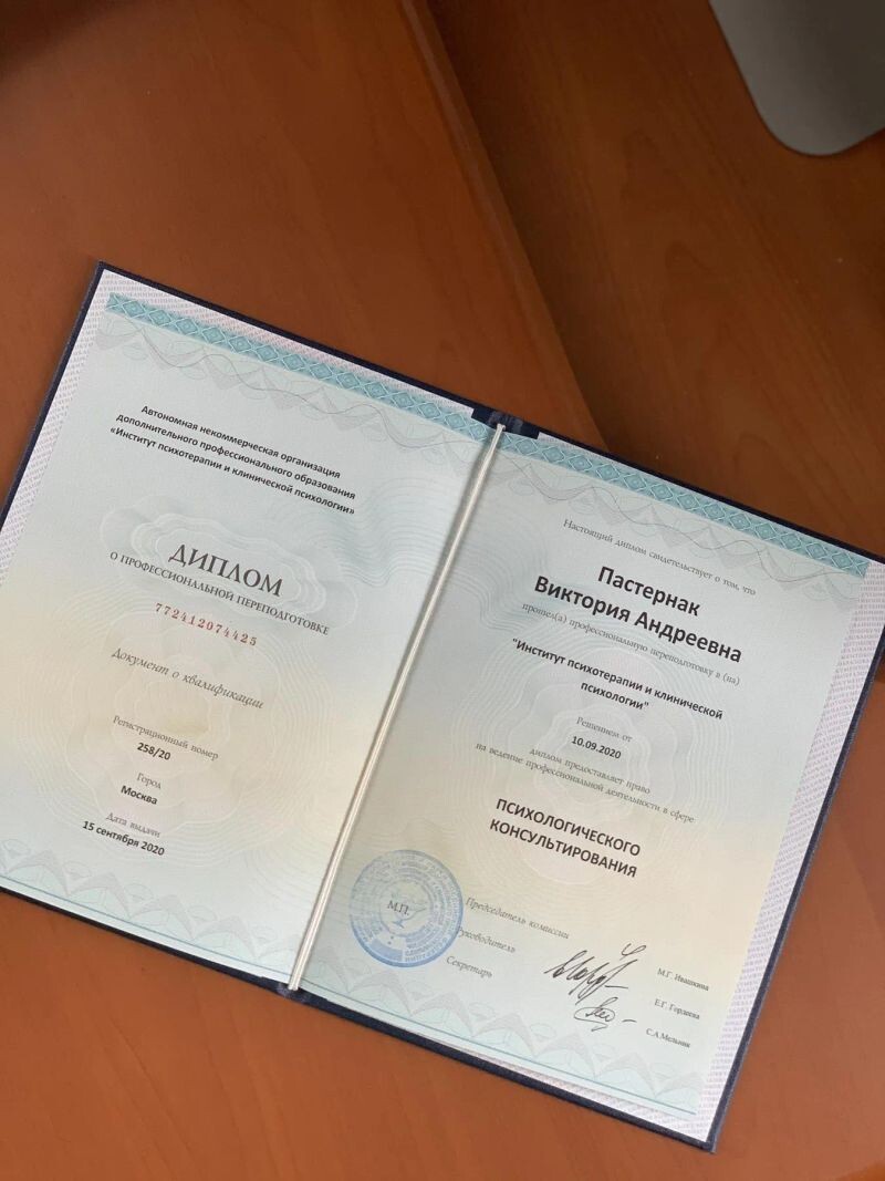 - Институт психотерапии и клинической психологии, психологическое консультирование, 2018–2020 гг.