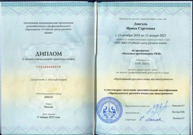 - Учебный центр МГУ, профессиональная переподготовка "Преподаватель русского языка как иностранного", 2024–2025 гг.