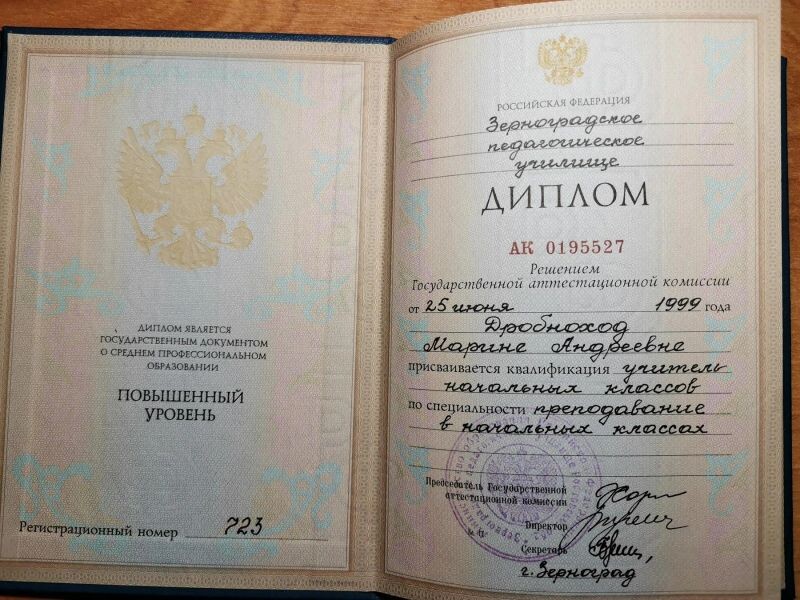 - Зерноградское педагогическое училище, специальность «преподавание в начальных классах», учитель начальных классов, 1996–1999 гг.