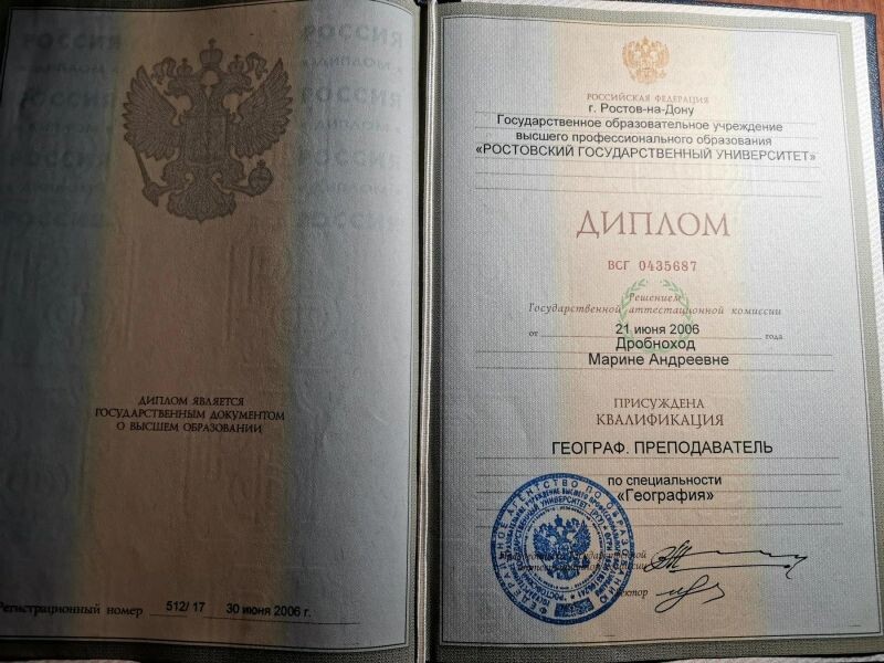 - Ростовский государственный университет, специальность «география», географ, преподаватель, 2001–2006 гг.
