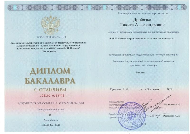 - Южно-Российский государственный политехнический университет (НПИ) имени М.И. Платова, наземные транспортно-технологические комплексы, 2021 г.