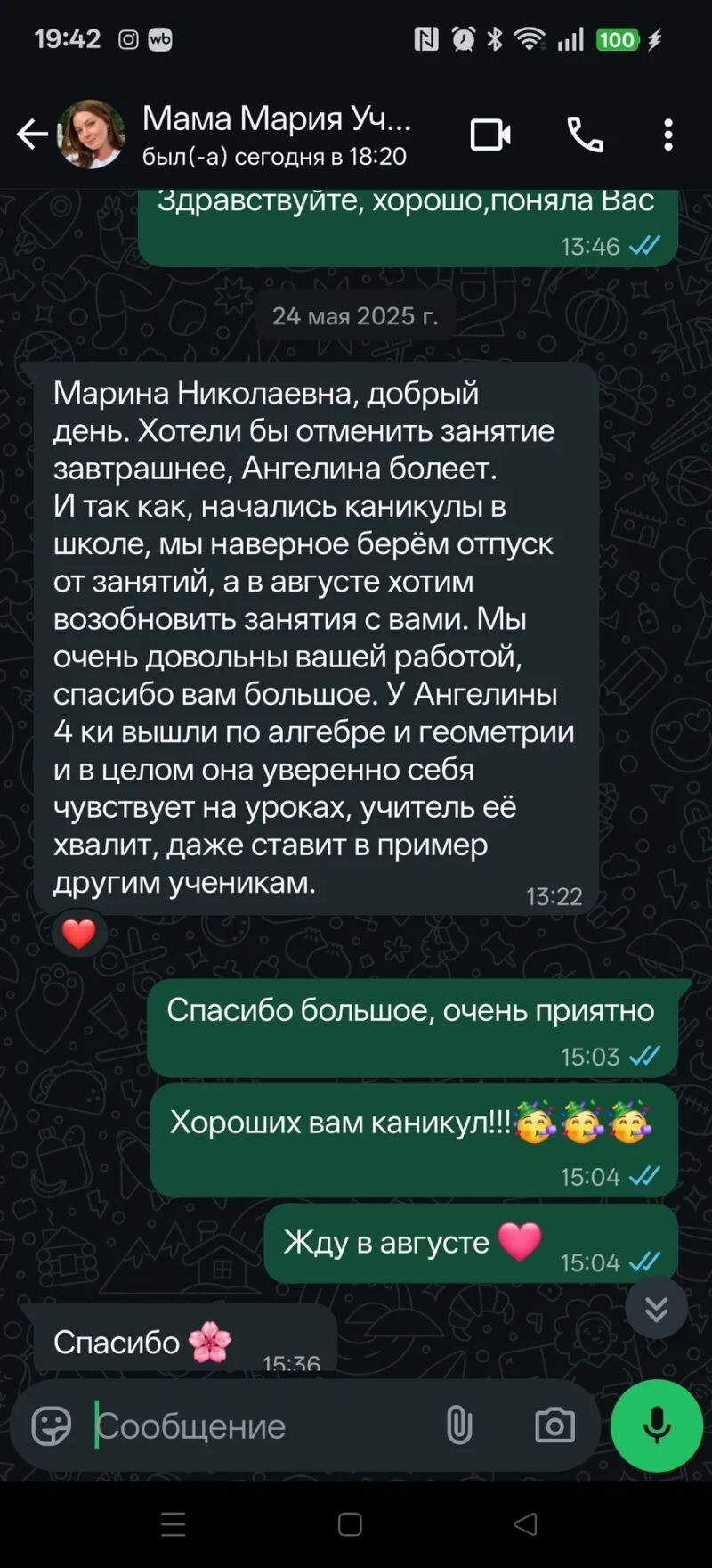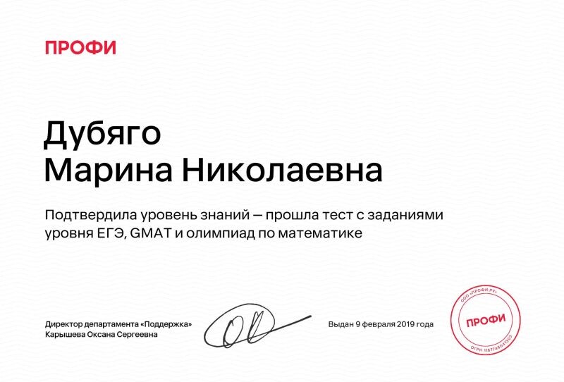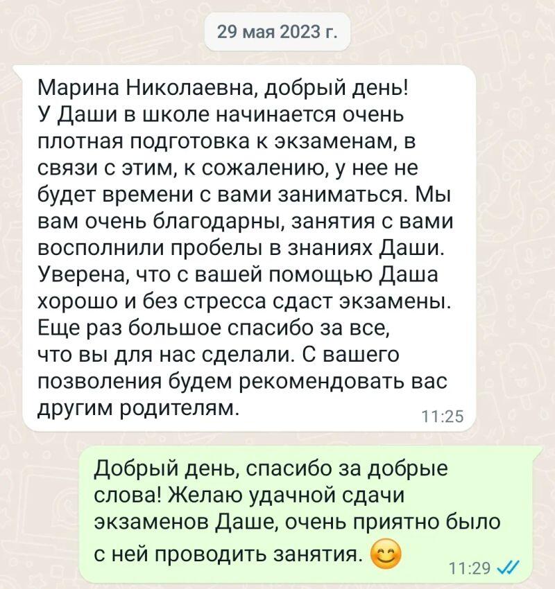 Марина Николаевна отличный педагог, она очень внимательная и всегда готова помочь с любыми задачами. Мы очень благодарны ей за помощь. Сегодня мы писали экзамен и ждем результатов.