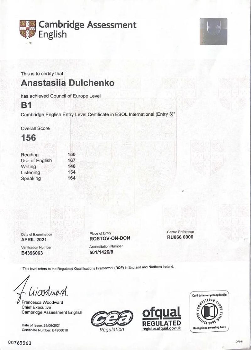 - Сертификат FCE (с 2021 г.).