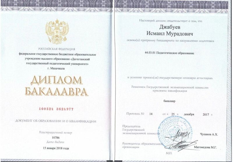 2023–2027 гг. - Дагестанский государственный педагогический университет, педагогическое образование, 2013–2017 гг.