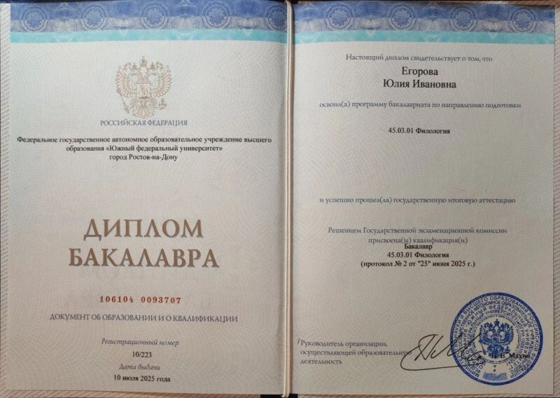 - Южный федеральный университет "Зарубежная филология", 2021–2025 гг.