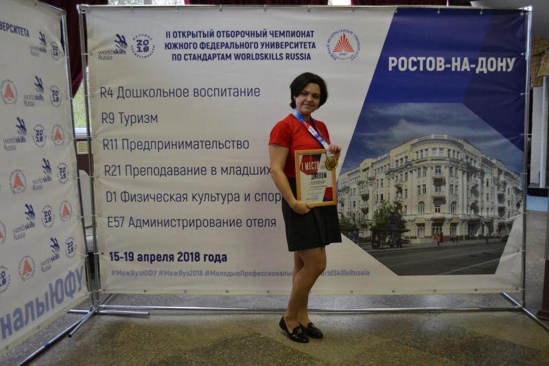 - Чемпионка ЮФО чемпионата молодых профессионалов по стандартам Worldskills, компетенция – преподавание в младших классах, 2018 г.