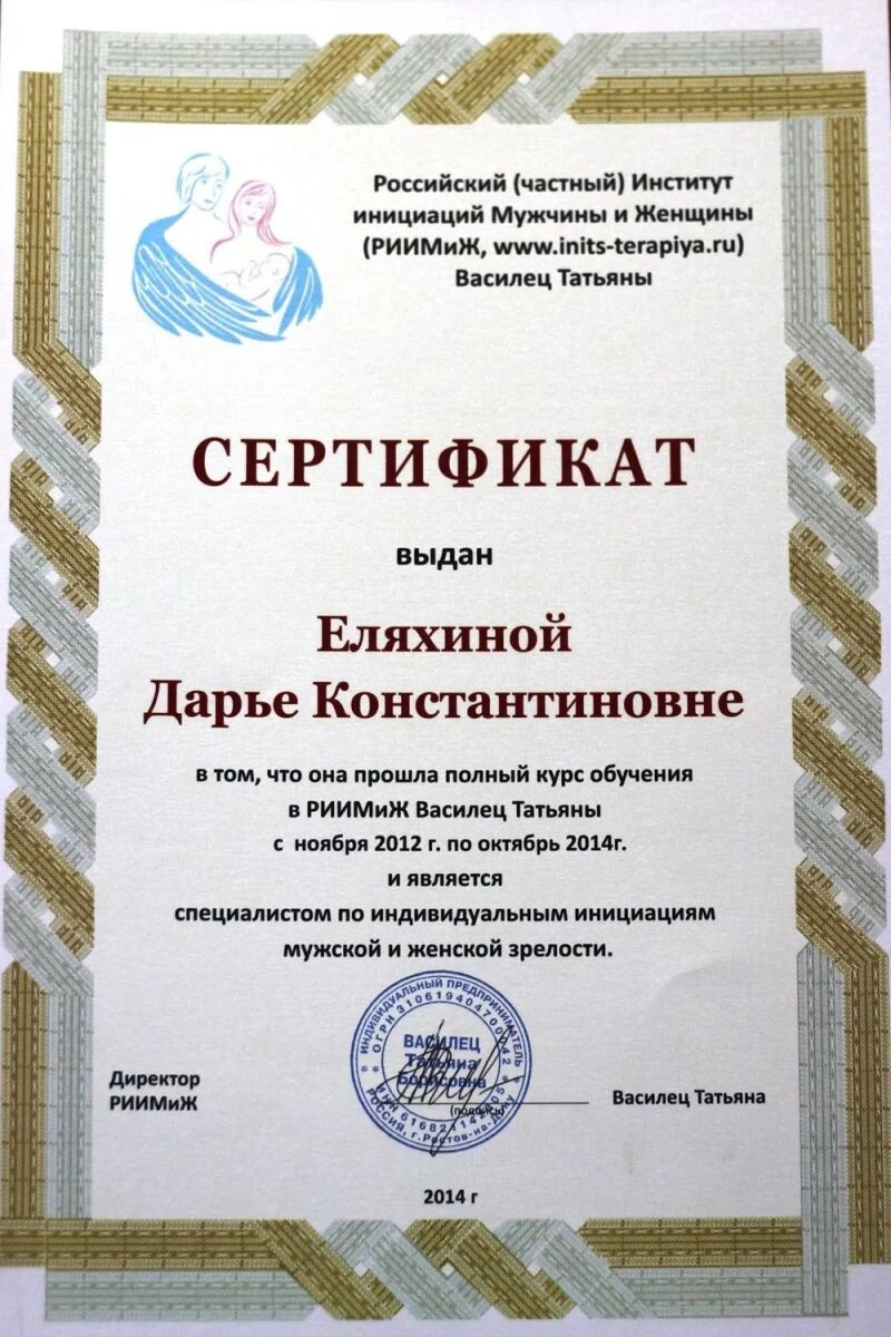 - Российский институт инициаций мужчины и женщины Василец Татьяны, специалист по индивидуальным инициациям мужской и женской зрелости, 2012–2014 гг.
