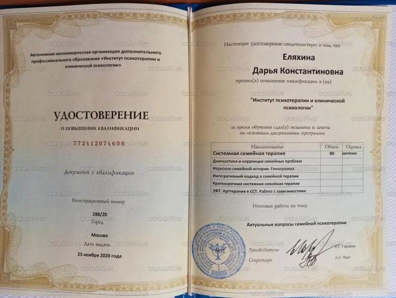 - Московский институт психотерапии и клинической психологии, повышение квалификации, 2020 г.