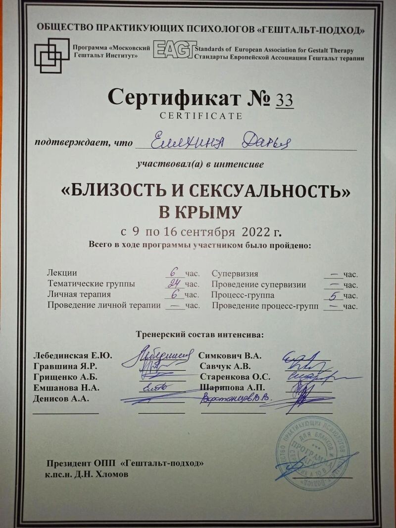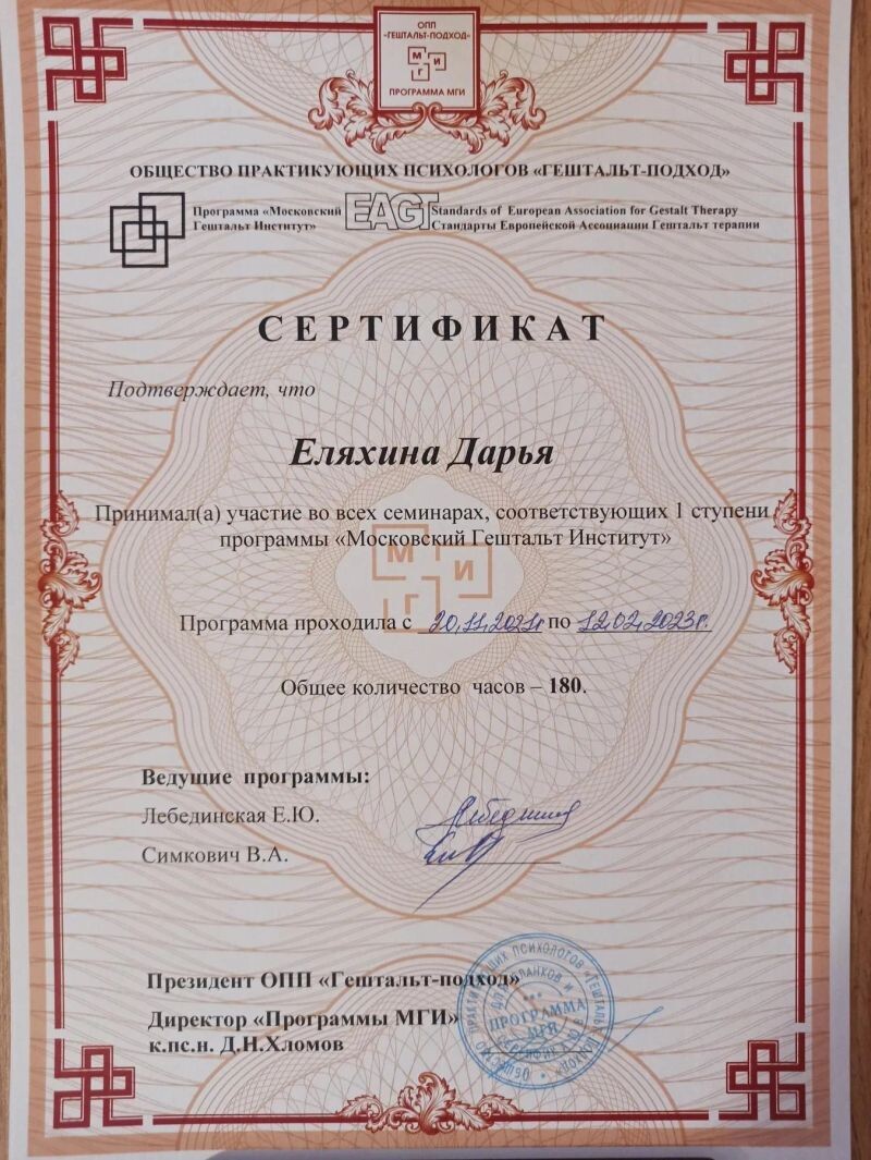 - ОПП «Гештальт-подход», программа МГИ, программа «Московский Гештальт Институт», 1 ступень, 2023 г.