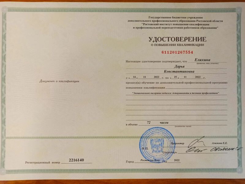 - Ростовский институт повышения квалификации и профессиональной переподготовки работников образования, программа «Эмоциональное выгорание педагога: детерминанты и техники профилактики», 2022 г.