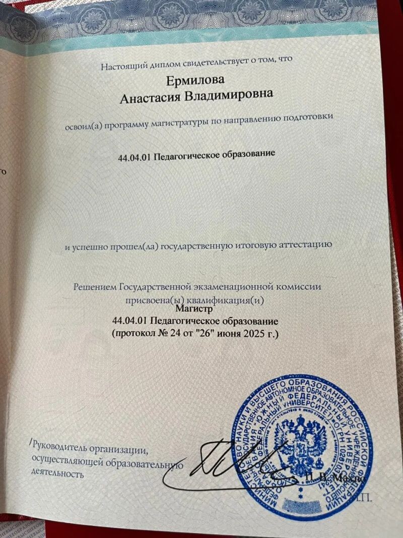 - Южный Федеральный Университет, Кафедра иберо-американских исследований и межкультурной коммуникации, Педагогическое образование с двумя профилями (испанский и английский языки), 2023–2025 гг.