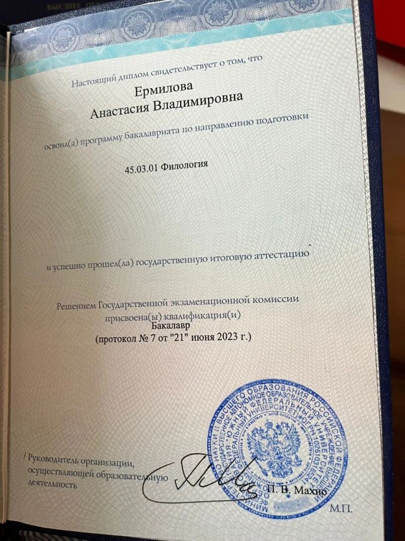 - Южный Федеральный Университет, Факультет филологии, Журналистики и Межкультурной коммуникации, Зарубежная филология, Филолог (испанский и английский языки), 2019–2023 гг.